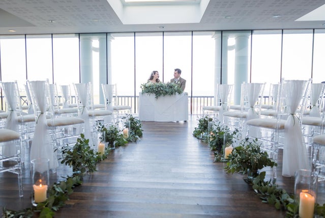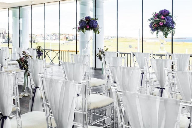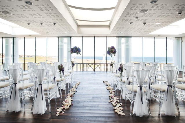 Floor-to-ceiling windows frame the North Sea coastline in the St Mary's Lighthouse Suite, where up to 140 guests can dine while watching waves break against Whitley Bay's shore. The lighthouse itself stands sentinel in the distance, creating a backdrop that changes with the tides and seasons - sometimes dramatic under stormy skies, sometimes serene in golden sunset light. We've hosted countless wedding celebrations in this space, and couples often tell us they chose it specifically for those panoramic coastal views. The room fills with natural light during daytime ceremonies, while evenings bring the gentle glow of the lighthouse beam sweeping across the water. Clear chairs draped in white fabric line wooden floors, and we work with your florist to create aisle arrangements that complement rather than compete with the scenery beyond. The suite accommodates different celebration styles comfortably. For traditional wedding breakfasts, we arrange tables for 140 seated guests, with everyone enjoying uninterrupted sea views. Switch to cocktail-style receptions and the space opens up for 250 people to mingle, dance, and step out onto our terraces. Your guests have exclusive use of the private bar - no queuing alongside other events - and dedicated toilets mean everything stays contained within your celebration. Our PA system handles ceremony music, speeches, and evening entertainment without any technical hiccups. Many couples bring their own playlist, though we can arrange a resident DJ who knows exactly how to work the room's acoustics. The wooden flooring proves popular with dancing guests, and those spectacular windows become mirrors after dark, doubling the twinkle of candles and fairy lights. Transport couldn't be simpler - we're right on Whitley Bay's seafront with excellent road and Metro links. Guests staying locally can stroll along the promenade, while those travelling from further afield find us easily signposted from major routes.